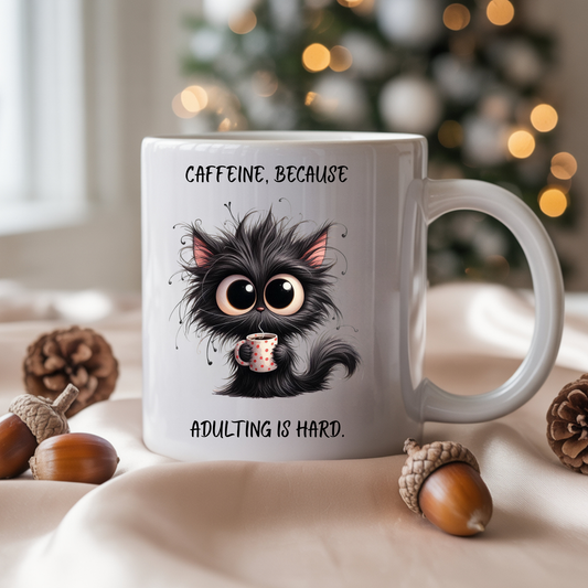 Adorable Fluffy Cat Mug | “Caffeine, Because Adulting Is Hard” Funny Coffee Cup