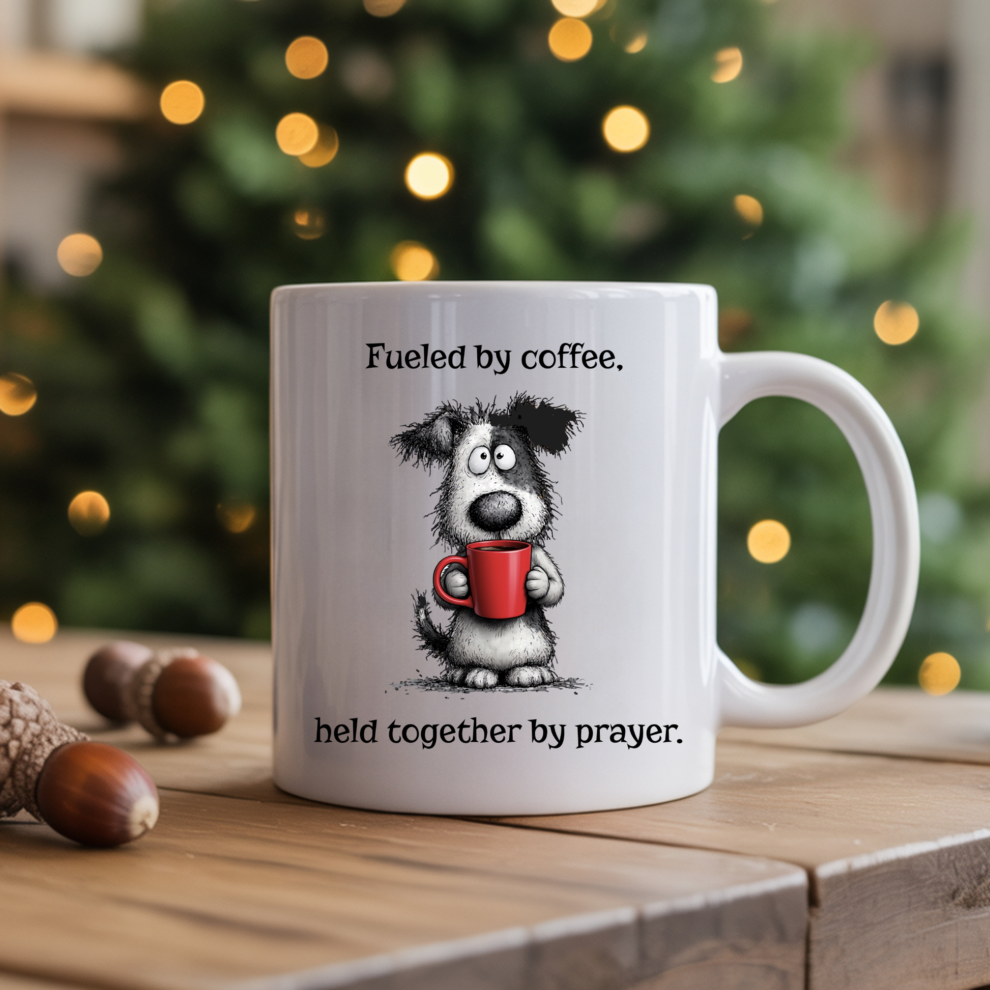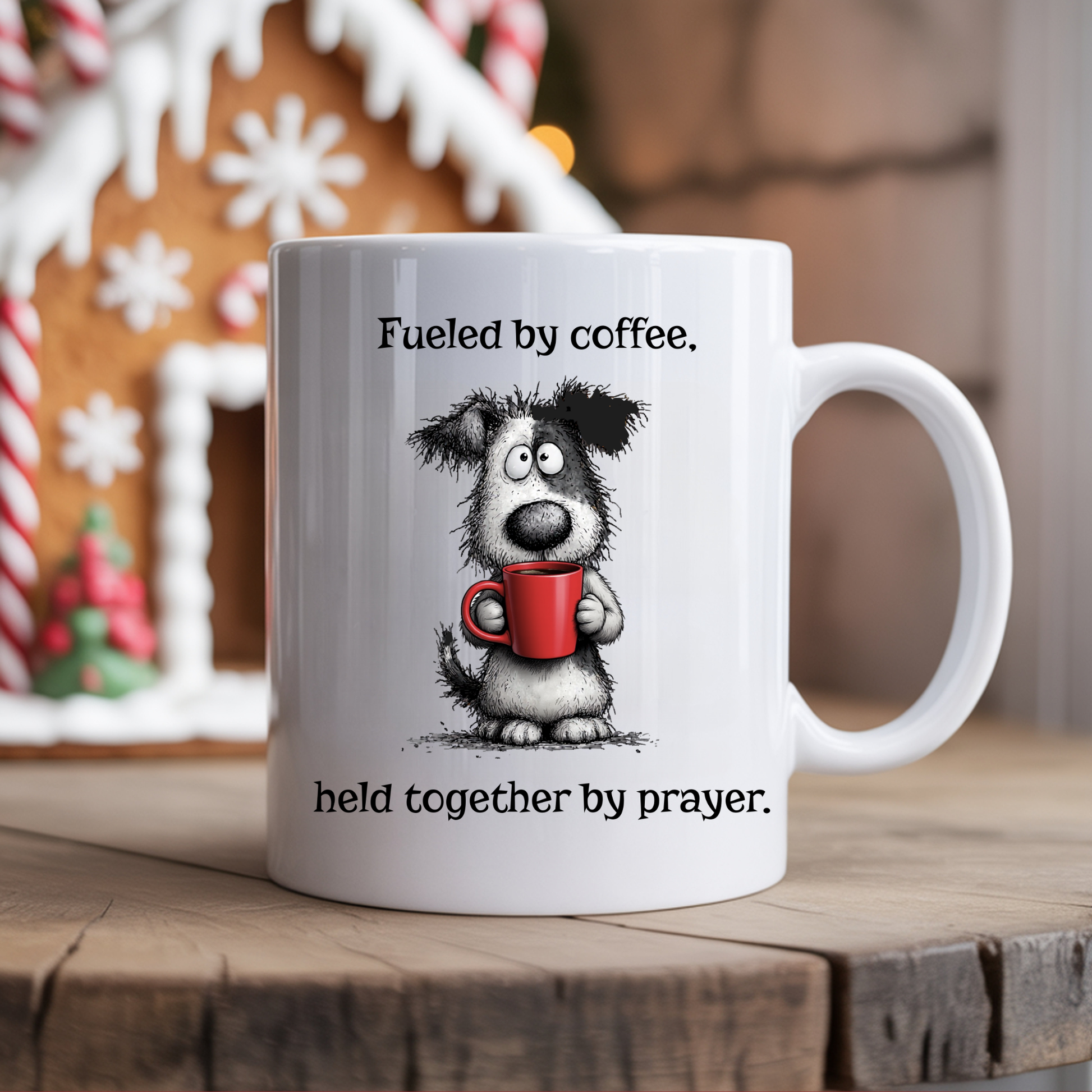 Start your day wrapped in comfort, faith, and a little caffeine. Our “Fueled by Coffee, Held Together by Prayer” mug features an adorable dog illustration holding a red coffee cup, paired with a heartfelt message that speaks to everyday faith and grace.